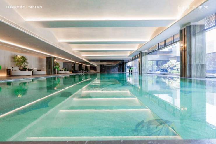 最令人惊艳的是下沉庭院,秉持“借水成景,自然共生”造园理念,打造中国黑奢石光面水幕墙,引广富林水韵入境,层层递进,浑然一体。马赛克拼花泳池、无边际玻璃幕墙、庭院镜面水景,波光云影彼此映照,呈现出“三泖回澜”的奢适意境。置身其中,仿佛能听见“明月松间照,清泉石上流”的诗意吟唱,感受到那份超脱尘世的人文意境。