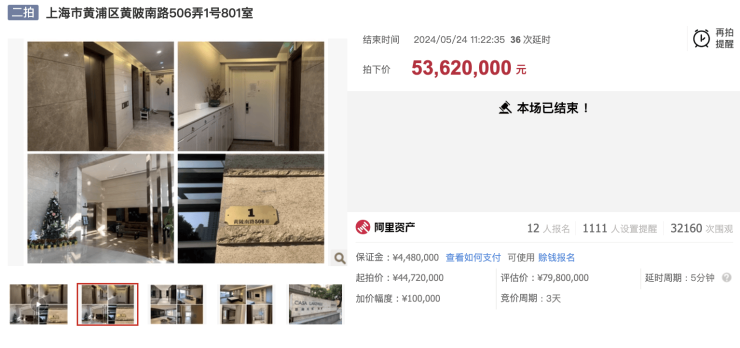 此次,该套房源在降价1118万元后再度上架,阿里拍卖平台显示,该房源在二拍环节共吸引32160次围观,12人报名,在经过36次延时以及86轮竞价后顺利成交。