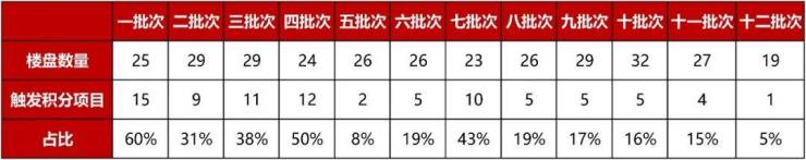 实行积分制近三年的时间中,市场涌现出大量的"高积分选手"、"社保巨子"。但今年以来,触发积分制的项目逐批次减少。其中第一批触发积分制的楼盘数量最多,十二批次截止到28号,触发积分的楼盘只有1个。全年累计84次触发积分。
