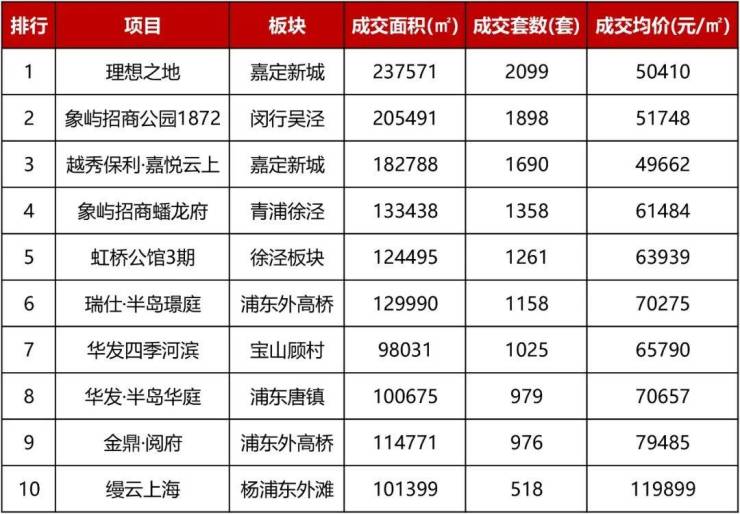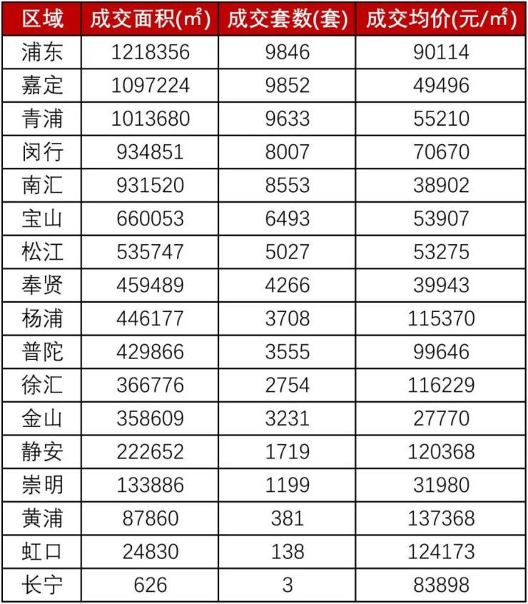 全市各区成交面积排行榜中,位于前三的分别为浦东(不含南汇)、嘉定、青浦。