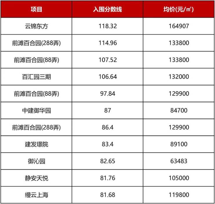 入围分超过80分的项目共11个,其中入围分破百的项目分别为云锦东方、前滩百合园(288弄)、前滩百合园(88弄)、百汇园三期,最高分到达118.32分。