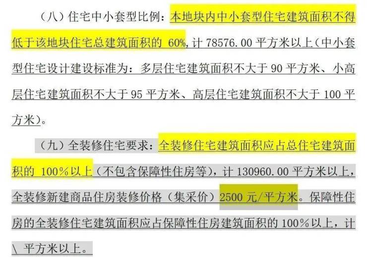 根据出让要求,地块要求60%的中小套户型占比,100%全装修,住宅下限1246套。