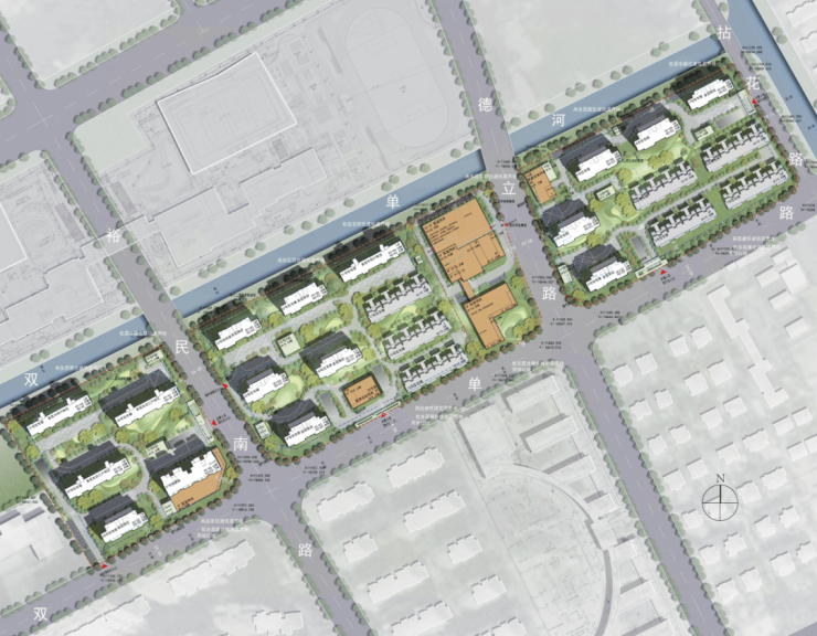 该地块东至拈花路,南至双单路,西至基地边界,北至双单河,面积73271㎡,容积率2.0,为商住用地。