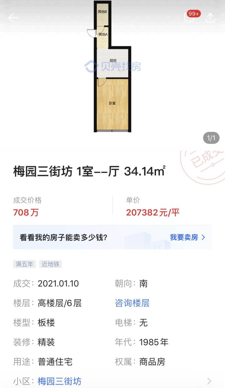此外,澎湃新闻从贝壳找房的成交记录上看到,在市场高峰期,2021年1月,梅园三街坊一套34.14平方米的房源成交价格为708万元,折合单价超20.7万元/平方米。而从当前的挂牌房源来看,34平方米左右的房源,挂牌单价普遍在15万元/平方米左右。