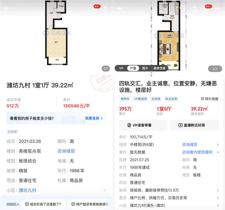 以潍坊九村一套40平方米左右的房源为例,贝壳找房成交记录显示,一套39.22平方米、总高6楼高楼层的房源于2021年3月成交总价为512万元,折合单价130546元/平方米。