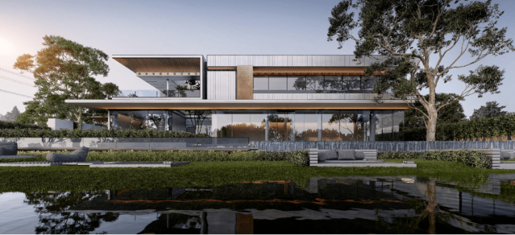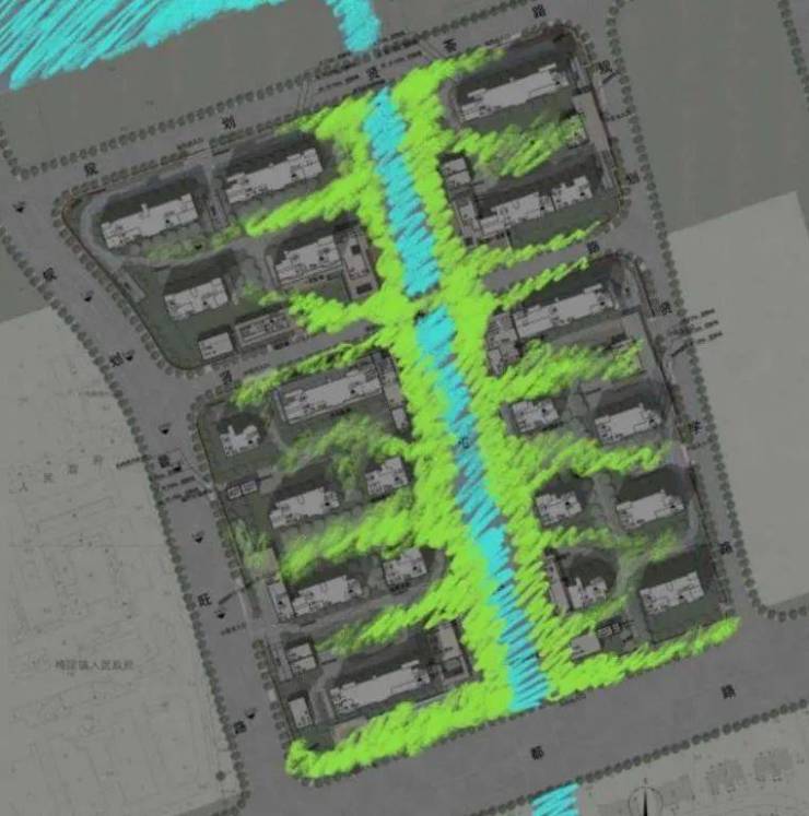 小区从入口礼仪庭院开始,打造一条引向水岸的滨河景观轴线,最大化借景外部水系资源,让社区建筑和自然景观,可以很好融合在一起