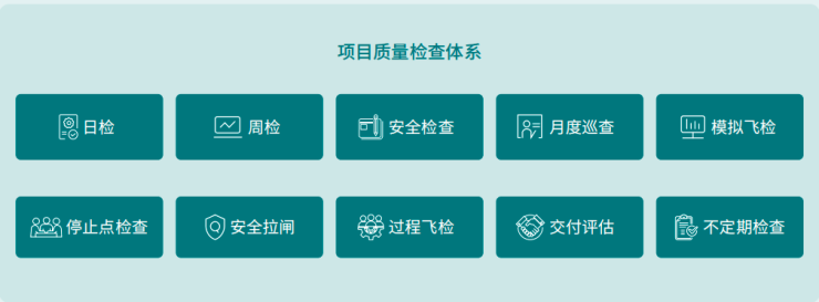 围绕全周期质量保障,形成质量检查、监控与风险评估体系,并不断探索新的质量管理举措,通过各项专题会议,总结实践经验,努力精进产品质量,确保为客户交出高品质答卷。