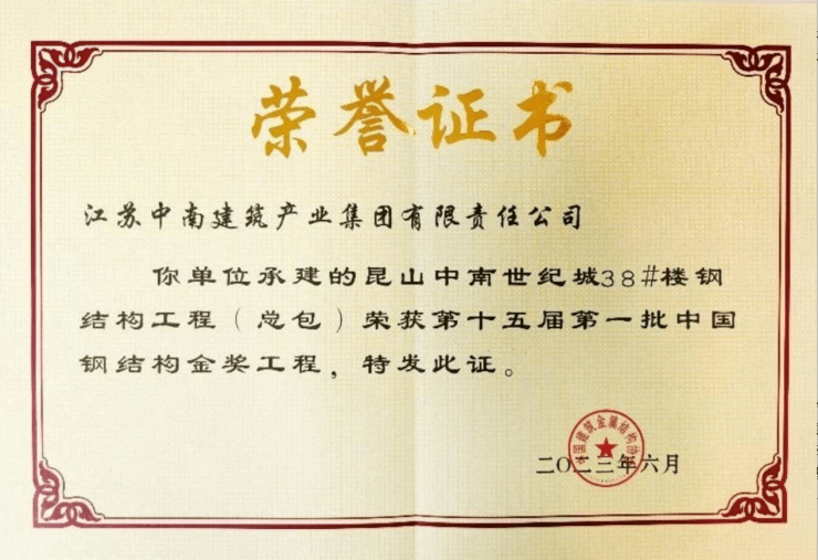 中南建筑坚守建精品工程理念,持续打造高品质建筑工程,屡获建筑行业质量最高荣誉奖。由中南建筑总承包施工的“昆山中南世纪锦城38#楼”、“萧政储出(2011)46号地块商业金融业、办公项目”(杭州市钱江世纪城H-12地块)荣获第十五届“中国钢结构金奖”;“海门熙悦S1#幕墙工程”、“苏中区域南通中央商务区A03地块G楼幕墙工程”荣获2022年度江苏省优质工程奖“扬子杯”;中南建筑联合东南大学、南通大学共同申报的科研成果“装配式框架耗能型预应力干式连接节点的设计与高效施工关键技术研究”荣获“2022年工程建设科学技术奖”。