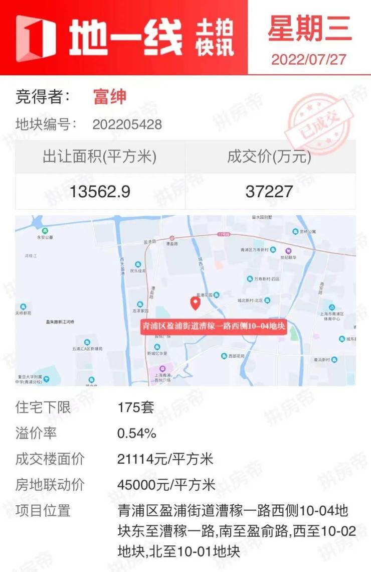 富绅竞得青浦区盈浦街道漕稼一路西侧10-04地块,成交楼板价21114元/㎡,溢价率0.54%,房地联动价45000元/㎡。