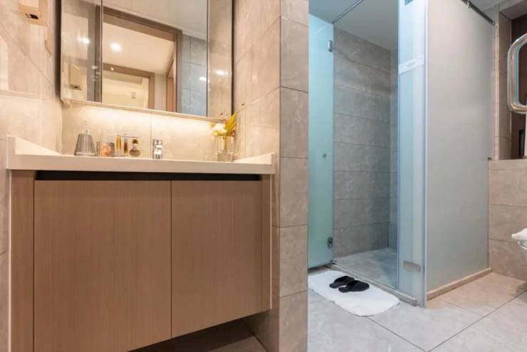 值得一提的是,峯汇在建面约90平的户型中,实现了独立三分离卫生间设计:进门洗手台,左侧淋浴间+右侧洗手间!