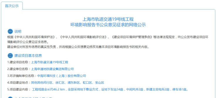10月8日,这条轨交线又传来了好消息——上海申通地铁建设集团有限公司上海市轨道交通19号线工程进行环境影响报告书公众意见征求公示(信息首次公示)。