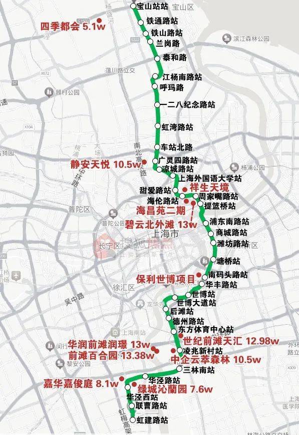 沿途经过宝山、虹口、浦东新区、徐汇、闵行,与多条轨道交通线路换乘,且两次穿越黄浦江,从南到北经过多个重要CBD,建成后将是超越1号线的南北向超级大动脉。