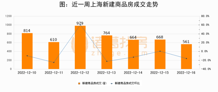 根据上海市房地产交易中心数据显示,2022年12月16日上海新建商品房成交561套,较昨日减少107套,环比下降16%