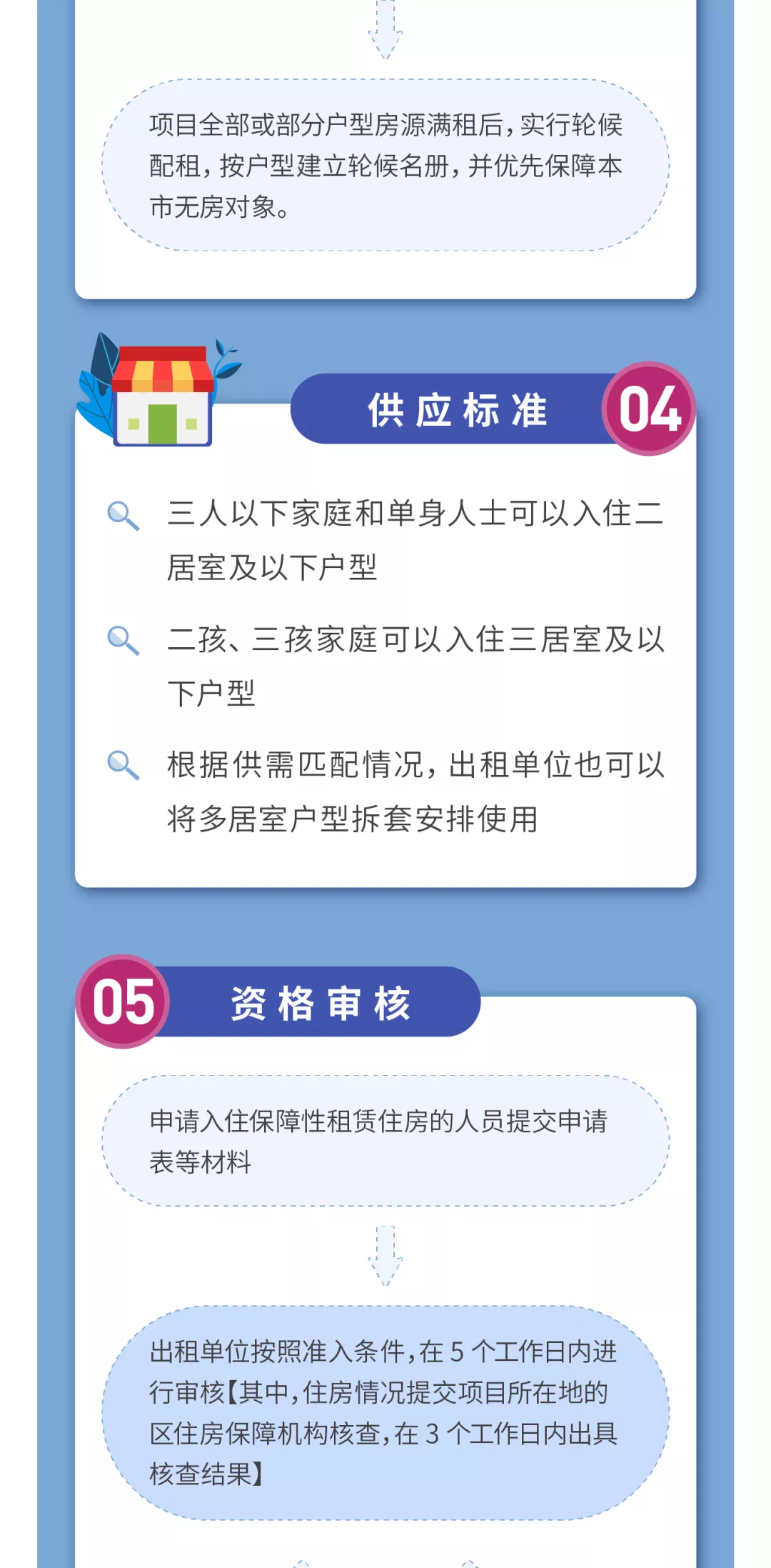 《管理办法》规定,三人以下家庭和单身人士可以入住二居室及以下户型,二孩、三孩家庭可以入住三居室及以下户型。根据供需匹配情况,出租单位也可以将多居室户型拆套安排使用。