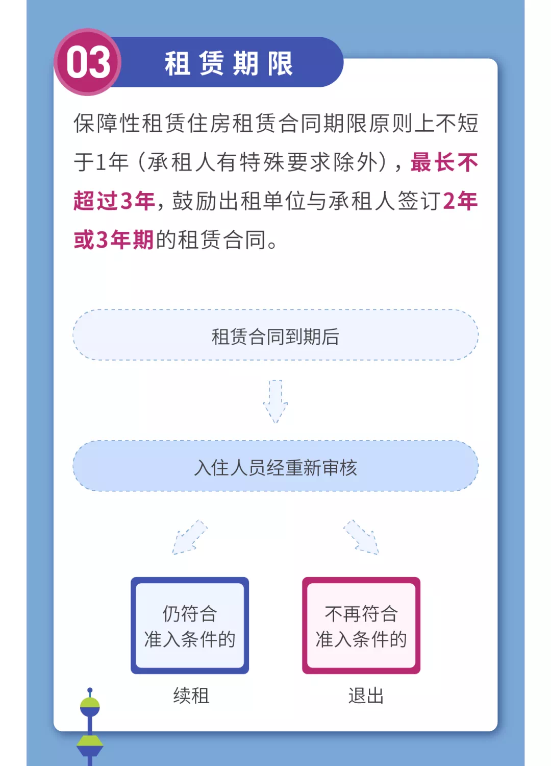 《管理办法》规定,租赁合同期限原则上不短于1年(承租人有特殊要求除外),最长不超过3年,鼓励出租单位与承租人签订2年或3年期的租赁合同。租赁合同到期后,入住人员经重新审核仍符合准入条件的,可以续租;不再符合准入条件的,应当退出。