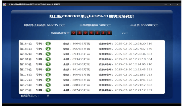 其中,虹口区C080302单元hk329-11地块率先开拍,该地块位于瑞虹新城十期瑧庭的西侧,被称为“瑞虹11期”,但瑞安并未参拍,五组竞买人分别为:1#中海,2#保利发展,3#招商+绿城,4#华润+越秀,5#金茂&新加坡庆隆。