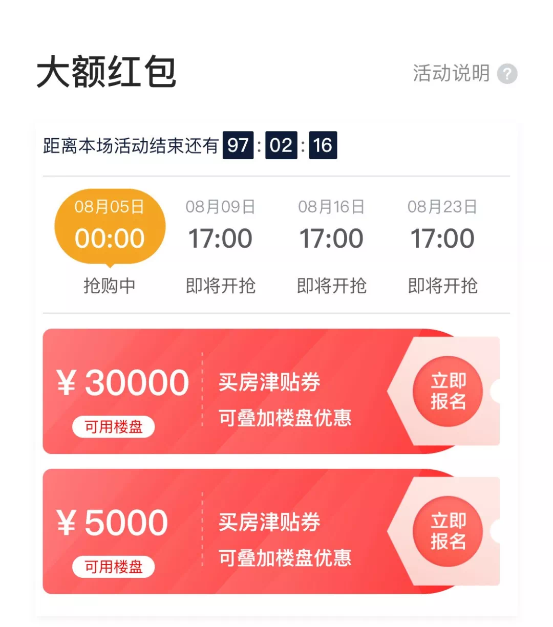 除以上楼盘优惠,在活动期间内用户可抽取搬家券、保洁券等礼包。还可抢较高5千、3万元的大额红包。客户报名领券,活动规定时间进行摇号,新房购房用户较高可抽取3万元购房大额红包,可与所有楼盘自身优惠叠加使用。