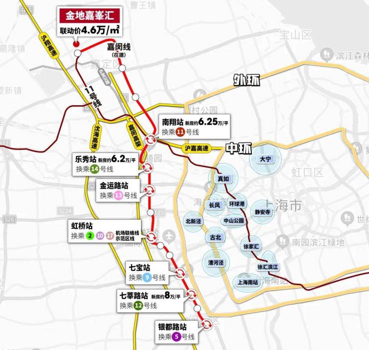 直线距离嘉闵线城北路站(在建)约200米,8站直达大虹桥,连接七宝、莘庄等多个CBD。同时,嘉闵线目前沿线新盘均价在6-8万/㎡,相比之下高层均价约4.5万/㎡的金地嘉峯汇洼地属性明显,未来必然能持续的从虹桥、市区两大中心导入人口,经久不衰!
