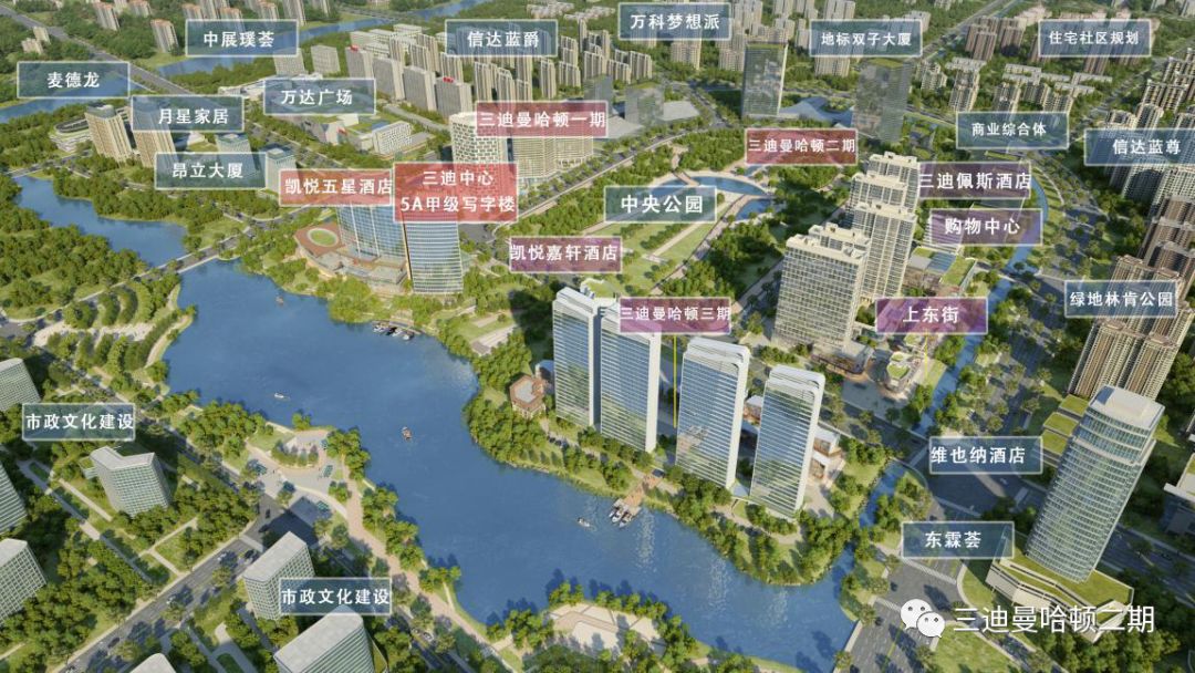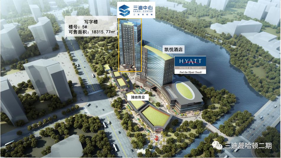 由三迪中心高端写字楼、奢华五星级凯悦酒店、国际娱乐商务会所、临湖景观餐饮休闲街区共同组成。