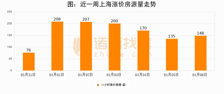 根据诸葛找房数据显示,上海24小时涨价房源量为148套,较04月05日增加13套,环比上涨9.6%。与此同时,涨价房源占比小幅扩大,业主信心有所提升。