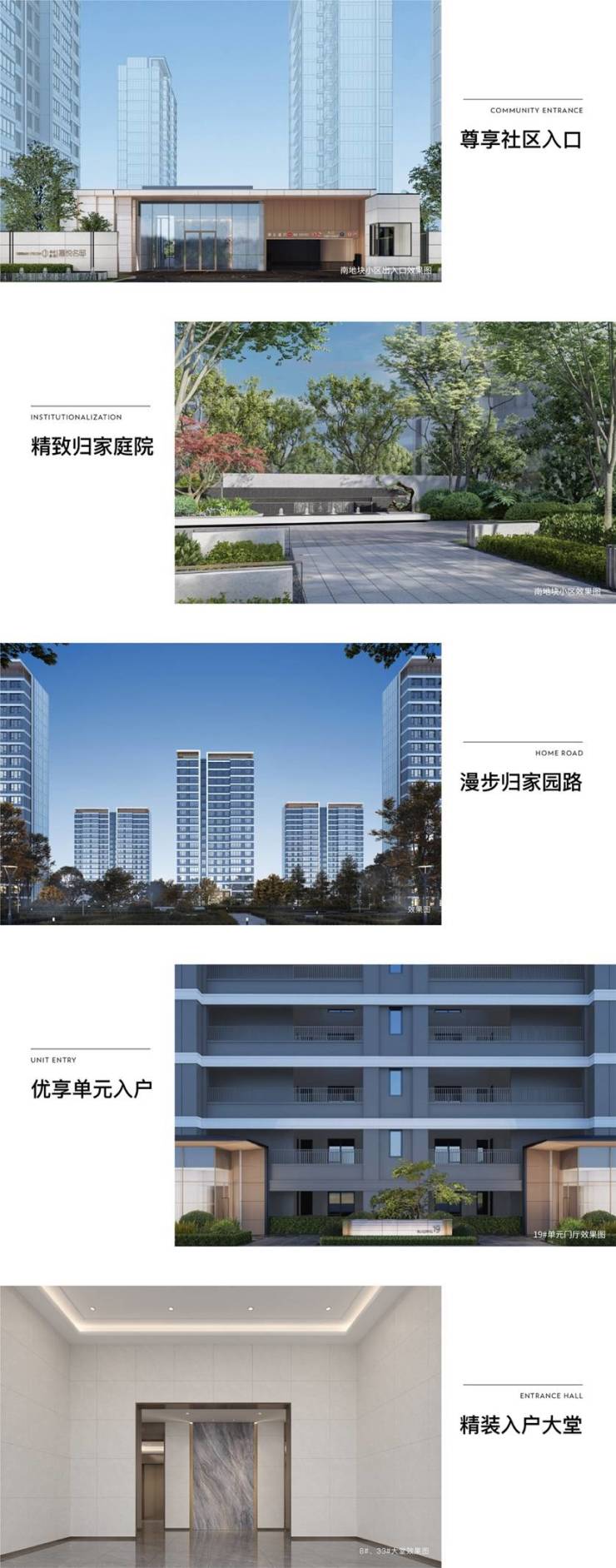 采用五重归家礼序,从尊享社区入口、精致归家庭院、漫步归家园路、优享单元入户与精装入户大堂在内的归家动线,串联社区景观与生活场景。