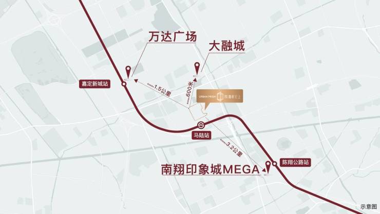 直线距离约100米步行至吉宝绿地缤纷城;直线距离约1公里可至约13万方嘉定大融城;南向1站至总面积约34万方南翔印象城。