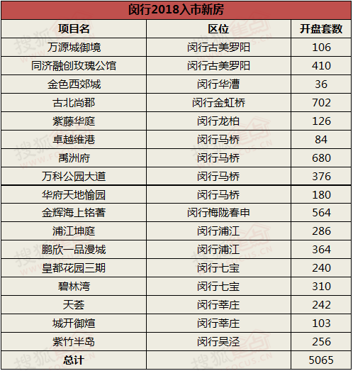 闵行区域2018年共17个项目推出新房源,总计5065套房源入市。闵行2018年度纯新盘较少,多是老盘加推。区域内的禹洲府一期2017年荣膺闵行区新房销售套数排名前列,今年也加推了680套房源。
