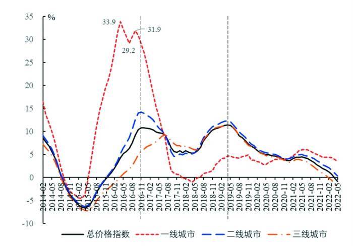 自2016年中央明确提出“房住不炒”定位以来,房地产市场经历了两轮价格调整过程。国家统计局70个大中城市新建商品住宅价格月同比增速数据显示,排名前列轮价格调整开始于2016年四季度。2016年11月和12月,70个大中城市新建商品住宅平均价格分别同比增长10.8%,达到新一轮价格周期的高点。与此相对应,一线城市新建商品住宅价格的同比涨幅已提前在2016年4月达到33.9%的高点。此后,在4至9月,房价涨幅处在29.2%以上的高位区间震荡,在9月达到31.9%的阶段性高点后,开始进入下行周期。二线城市房价同比涨幅在2016年11月达到14.2%的高点后开始进入回调,走势与总价格指数基本同步。三线城市房价调整则相对滞后,其价格同比涨幅在2017年7月达到9.3%的高点后开始回落。