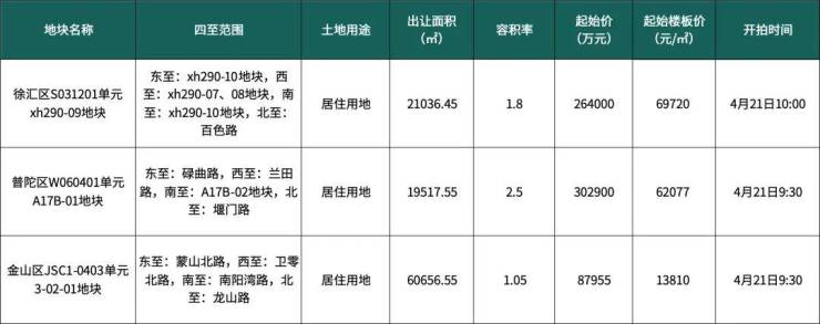 本批次将推出三宗纯住宅地块,分别位于徐汇、普陀、金山,合计出让面积约10.12万㎡,起始总价65.4855亿元。