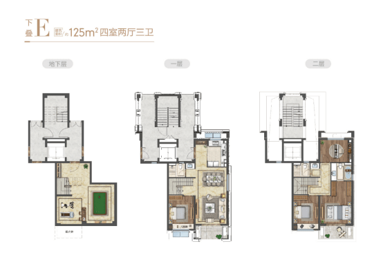 下叠建面约125㎡,四室两厅三卫格局,三代同堂而居各有天地。庭前绿地可以是孩子的自然游乐场,承载他们奔跑的童年;也可以是家人的后花园,成为周末BBQ、萌宠玩耍的悠享天地。