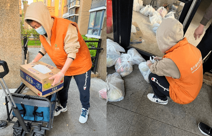 从联系居委、摸排居民情况,到做登记、对接可以采购的超市和供应商,再到收货、卸货、分拣、装袋和配送,一周2次,保证大家生活物资的供应。