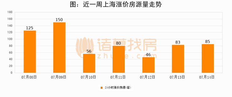 根据诸葛找房数据显示,上海24小时涨价房源量为85套,较07月13日增加2套,环比上涨2.4%。与此同时,涨价房源占比小幅扩大,业主信心有所提升。