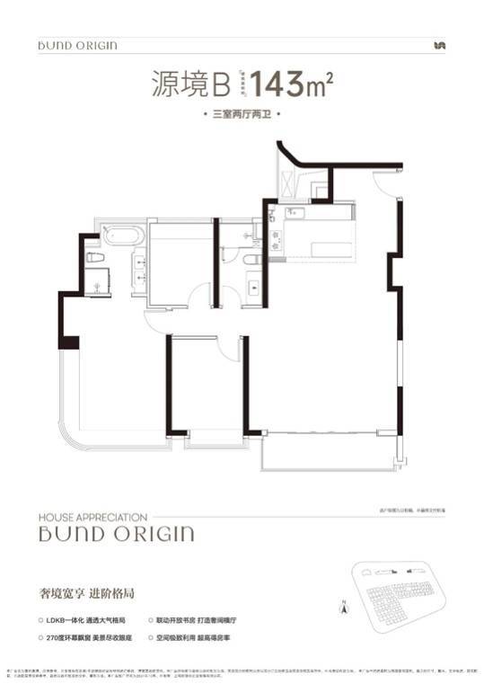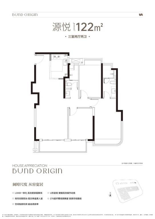 建面约122㎡3房2厅2卫,非常标准的动静分离、三开间朝南户型。几乎保留了前一个户型所有的优势,但在尺度感、私密性和舒适度上又有突破,不管是采光、视野、通风、私密性,还是实用性都十分出色。主卧拥有270度环幕观景飘窗,视野和采光都非常好。