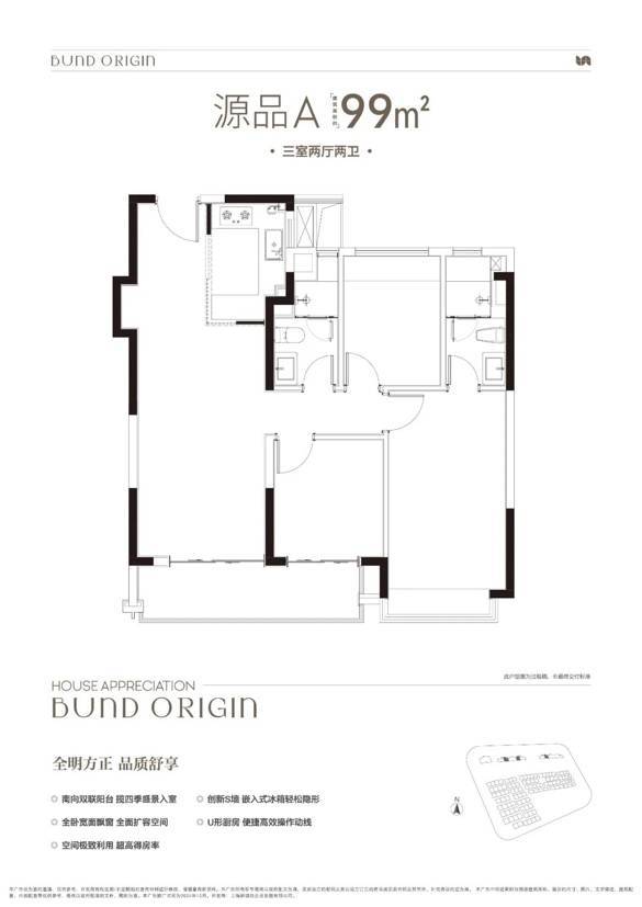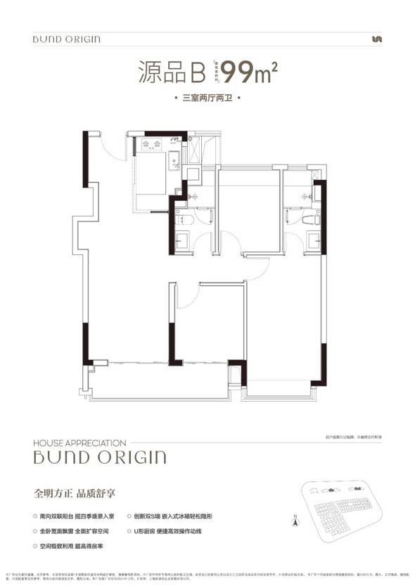建面约99㎡3房2厅2卫,非常标准的动静分离、三开间朝南户型。"分户s墙"设计在分户墙处增设“凹型空间",“冰箱外移"增加厨房操作台面和收纳空间,创造更合理的餐厨桌台动线。三开间朝南+南向双阳台设计+全卧室带飘窗,为整个户型带去非常出色的采光,同时室内视野的延展性很强。动静分离则是把功能区与休息区分割,加上主卧套房的设计,让业主有更好的私密性和生活舒适度。