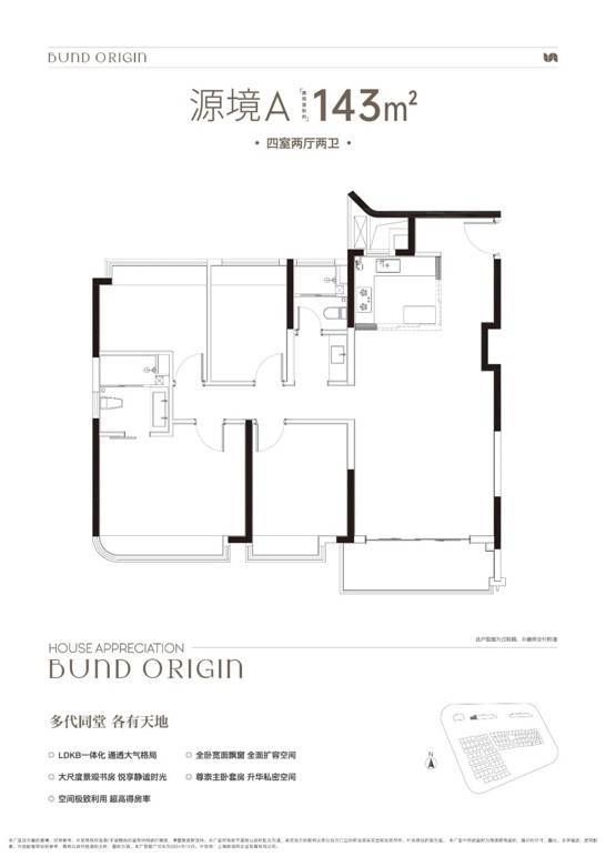 建面约143㎡户型,分为A/B户型,功能侧重完全不同。A户型是4房2厅2卫格局,三开间朝南+LDKB一体化+全卧室带飘窗+主卧套房设计+动静分离,居住功能性更强。B户型是3房2厅2卫格局,三开间朝南+LDKB一体化+奢阔宽厅+全卧室带飘窗+主卧套房设计+动静分离+主卧270度飘窗,舒适度更高。