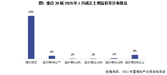 聚焦到重点30城来看,1月份的平均溢价率更是高达15.3%,重点城市热度明显高于全国市场平均。具体来看,底价成交的地块占比仍有83%,溢价率在5%以下的地块占比6%,此外还有8%的地块溢价率在20%以上,土地热度出现标准的“两头高、中间低”的分布。市场整体依然以底价成交为主,但个别地块的热度较高,也确实带动整体溢价率表现突出。