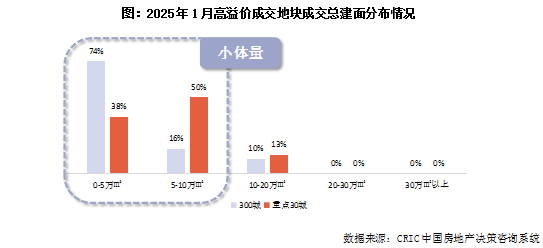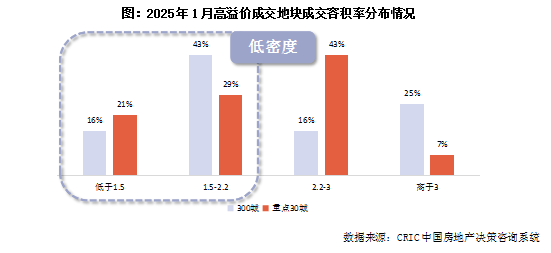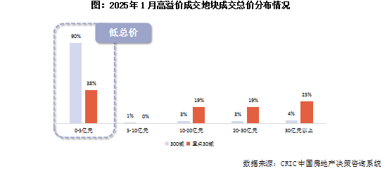 CRIC筛选出1月份成交溢价率超过10%的地块作为高溢价地块样本,占1月份总成交地块幅数的10%左右。总体来看,高溢价地块有低总价、小体量以及低密度三个主要特征,但由于样本范围的不同,三个主要特征的表现也有所不同。