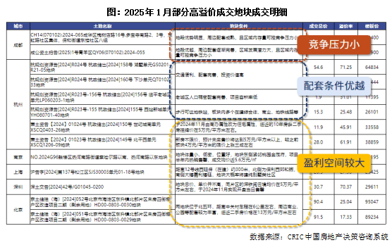 CRIC筛选出1月份一线和二线城市成交的典型高溢价地块,具体来看每一宗地的地块条件中,市场竞争压力、配套条件和盈利空间三者是拿地企业最为关注的亮点,能够高溢价成交的地块至少在其中一点上表现优秀。