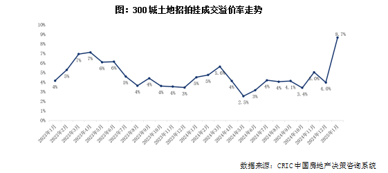 1月份核心城市有较多备受关注的优质地块出让,北京、深圳、杭州等城市均实现了土拍“开门红”,加之三四线城市土地成交比例下降,2025年1月平均溢价率提升至8.7%,创2022年以来的新高。