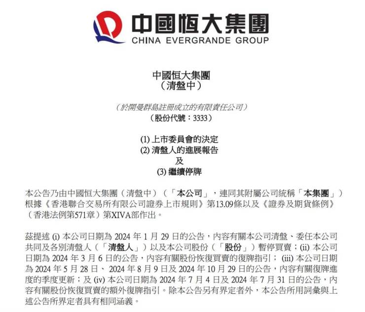 8月12日晚,中国恒大发布公告,公司收到联交所发出的信函,表示基于公司未能满足联交所对其施加的复牌指引中的任何要求,且股份一直暂停买卖并未于2025年7月28日之前恢复买卖,联交所的上市委员会根据上市规则第6.01A(1)条已决定取消公司的上市地位。股份上市的最后一天为2025年8月22日,并将于8月25日上午9时起取消股份上市地位。