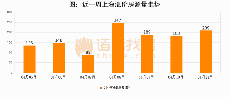 根据诸葛找房数据显示,上海24小时涨价房源量为209套,较04月10日增加26套,环比上涨14.2%。与此同时,涨价房源占比小幅扩大,业主信心有所提升。