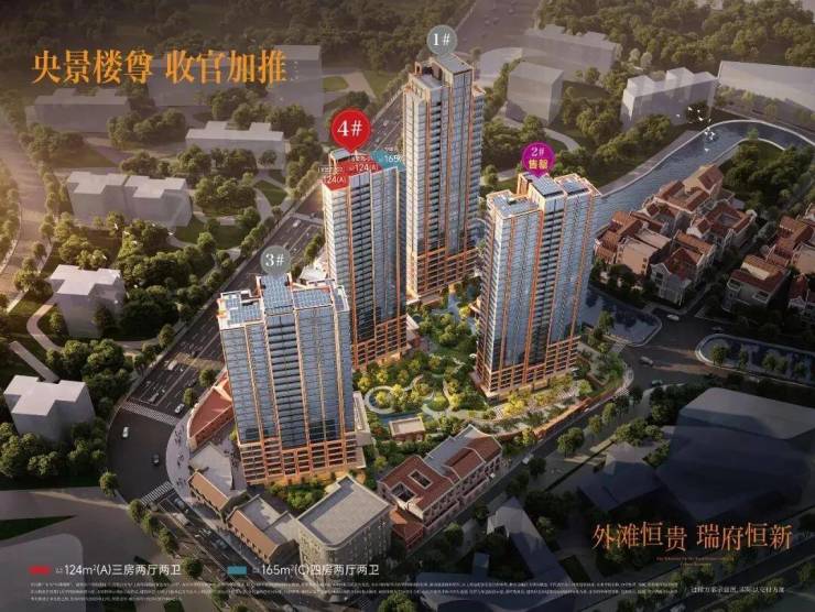目前区域内在售新盘主要有三个。其中,外滩瑞府已经全部推出,主推建面约124-330㎡3-4房,均价14.85万/㎡。