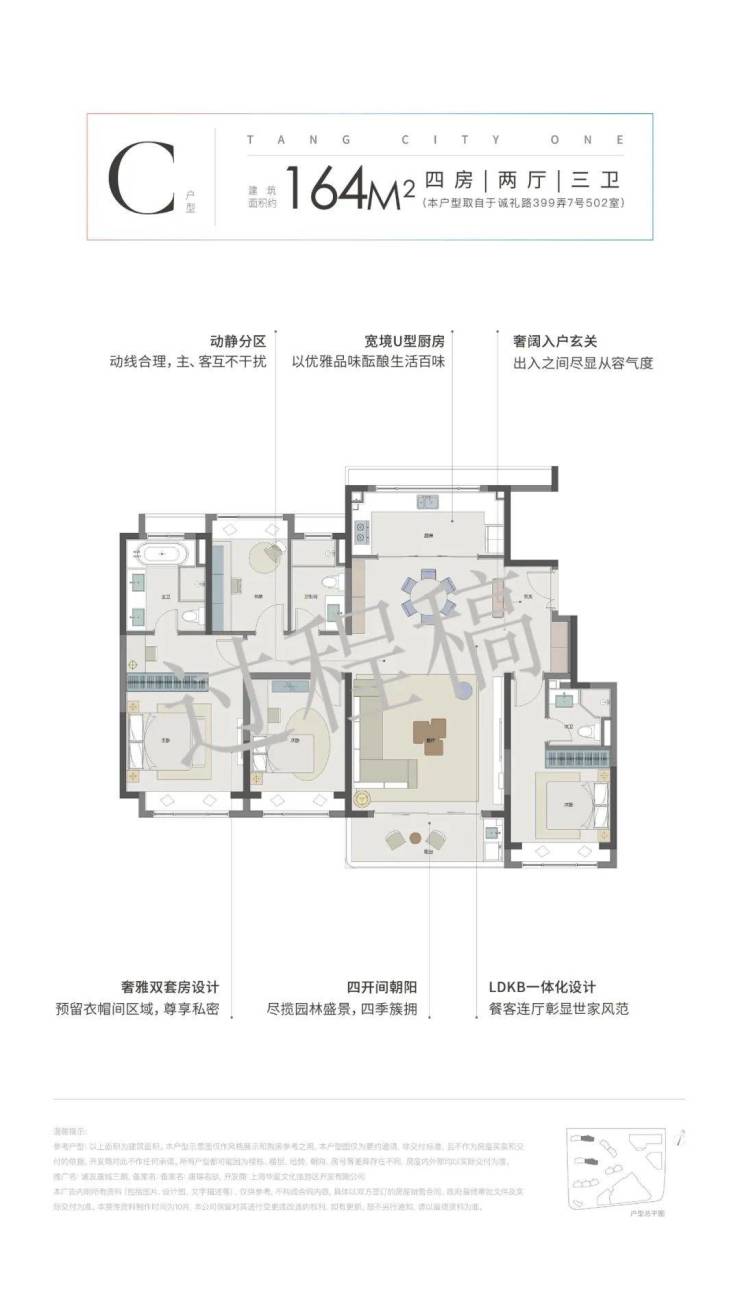 住宅主力户型有:建面约102㎡3房2厅2卫、约112㎡3房2厅2卫,约164㎡4房2厅3卫。