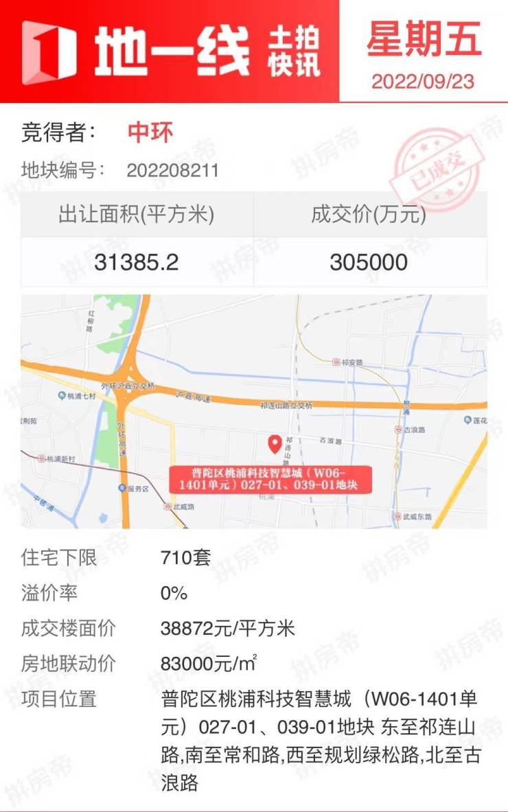 地一线 | 中环、宝华拿下普陀桃浦2幅地块,房地联动价83000元/㎡