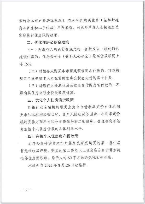 为更好满足居民刚性住房需求和多样化改善性住房需求,促进房地产市场平稳健康发展,8月25日,市住房城乡建设管理委、市房屋管理局、市财政局、市税务局、人民银行上海市分行、市公积金管理中心等六部门联合印发《关于优化调整本市房地产政策措施的通知》(以下简称《通知》),包括调减住房限购、优化住房公积金、优化个人住房信贷以及完善个人住房房产税等政策。《通知》自2025年8月26日起施行。