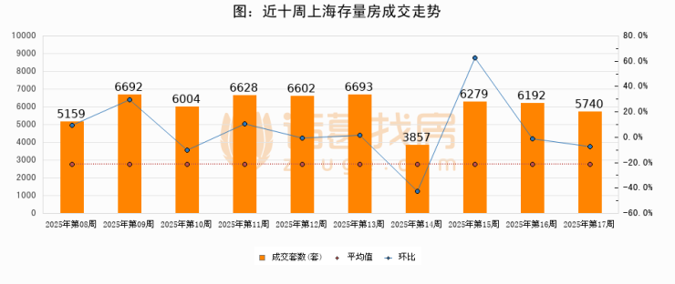 存量房方面,第17周上海存量房成交5740套,较上周减少452套,环比下降7.3%。从近十周成交走势来看,周均成交套数为5984套,本周低于平均水平4.1%。