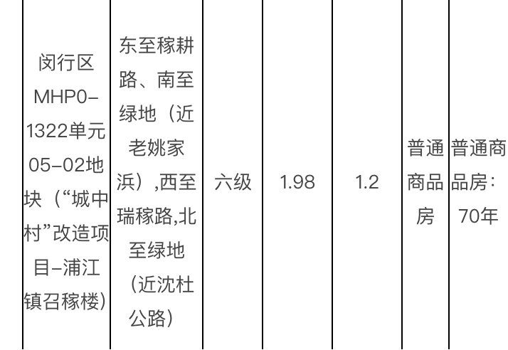 12月10日,上海市规划和自然资源局发布一则土地出让信息:闵行区MHP0-1322单元05-02地块(“城中村”改造项目-浦江镇召稼楼)拟以协议方式出让。