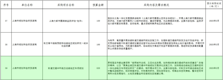 此外,上海市规划和自然资源局公示,《轨道交通中环线及沿线地区专项规划》进入上海市级预算单位采购意向一览表,采购时间2025年3月。