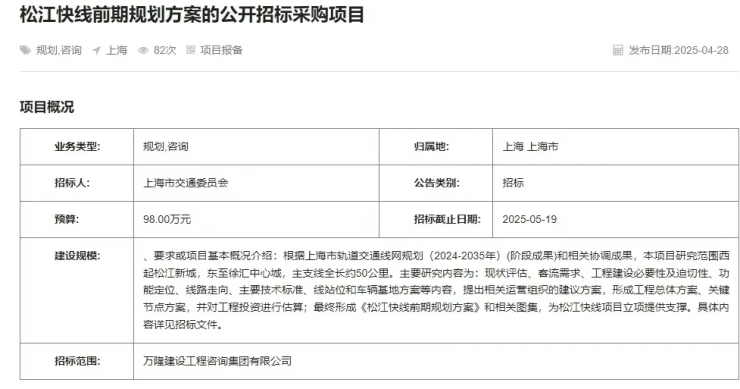 和嘉定快线几乎同时,另一条同样连接城央与新城的快线轨交——松江快线,也由上海交通委发起前期规划方案公开招标了。