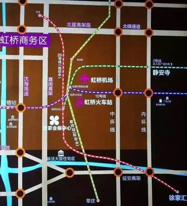 目前,25号线规划一直备受关注且存在诸多讨论。从下方示意图上,可以看到25号线(红色虚线表示)的规划路线是从闵行最北端纪王站出发,途经古北、国家会展中心、虹桥商务区等重要区域,最后直达徐家汇。此外还存在多种支线、比如西延(例如到华新、白鹤)方案,但基本走向可能性最大的就是徐汇-纪王。